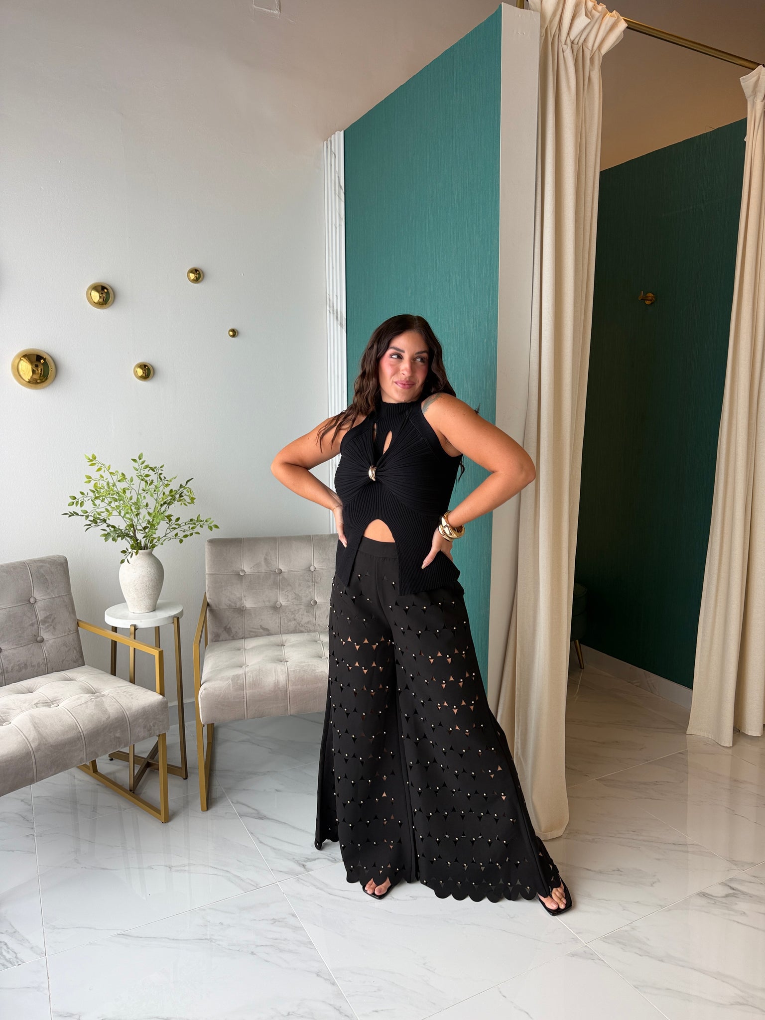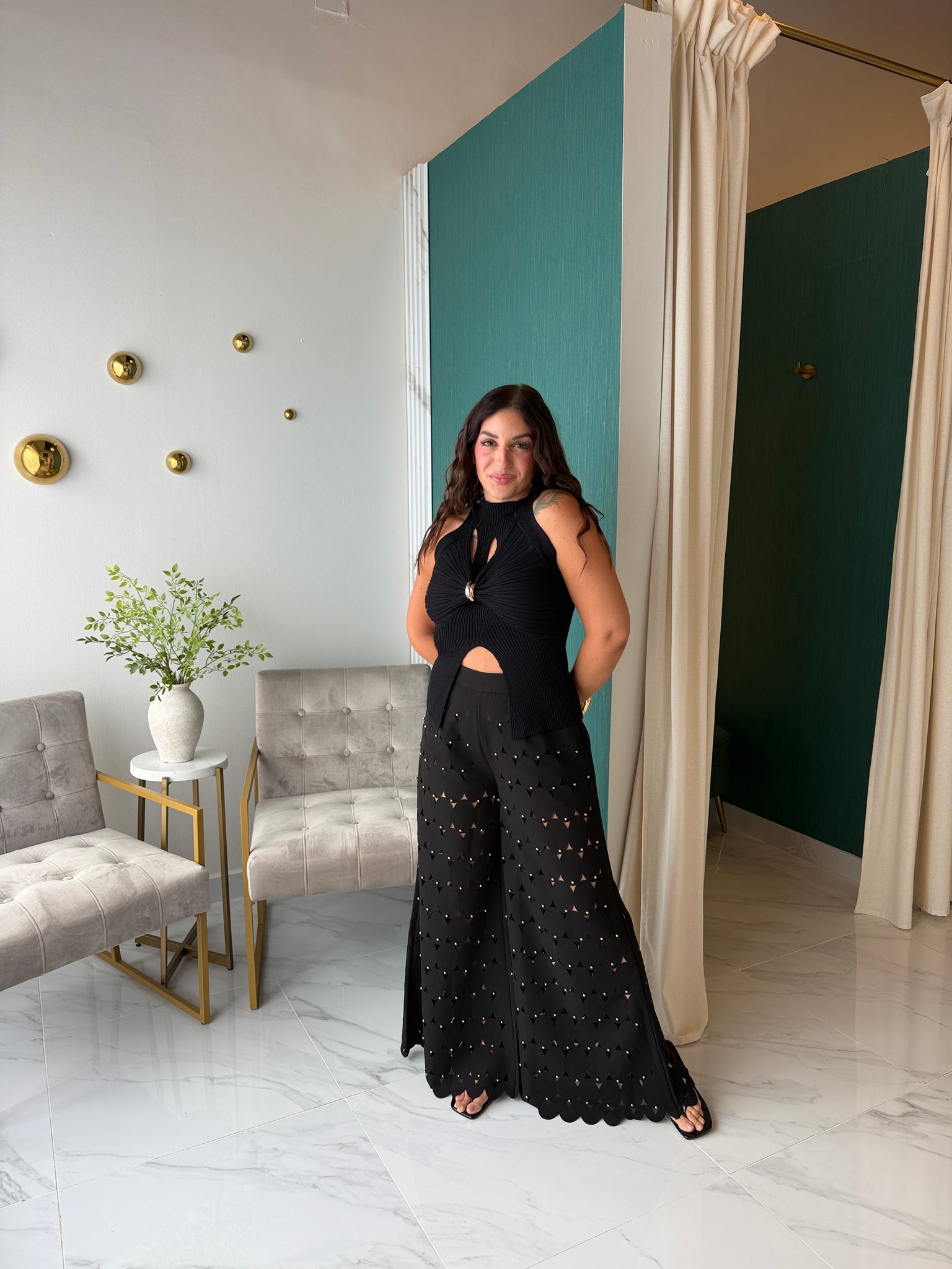Black Studded Cut WideLeg Pants